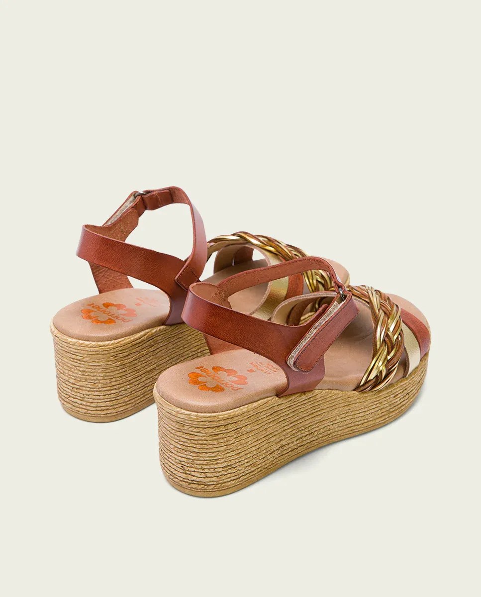 Sandalia de Porronet con cuña, pala forrada por tiras de piel y trenza textil entrelazadas. Cierre mediante tira de piel al tobillo ajustable con velcro. Plantilla acolchada de piel que garantiza una gran comodidad. Cuña de 6cm y plataforma de 3cm. Fabricado artesanalmente en España.